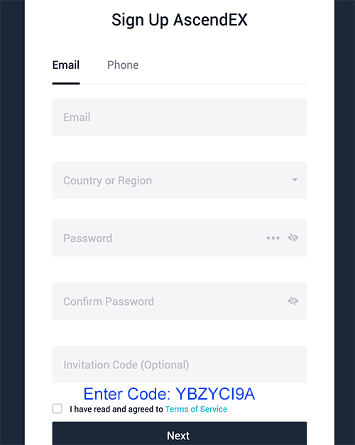 Take advantage of an AscendEX Commission Kickback Rate of -20% commission rate as AscendEX referral bonus, write the AscendEX invitation code YBZYCI9A in the field “Invitation Code (Optional)” in the registration form as in the figure below, or easy click the Bitmax ref link https://ascendex.com/register?inviteCode=YBZYCI9A for process your registration.