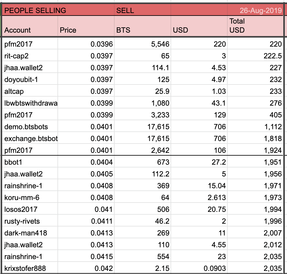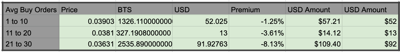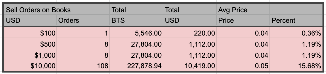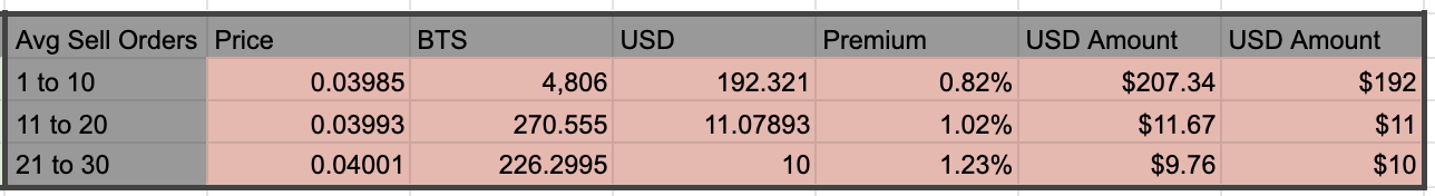 The 20th to 30th 10 sell orders offer up an average of 226 BTS for 9.59 USD or about $9.76.