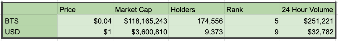 The first asset is BTS which had a recent price of $0.04314 and had a market capitalization of $118,165,243 with 174,556 accounts or people holding it. This market was ranked 5th on activity based on a 24 hour trading volume of $251,221 on a recent day.