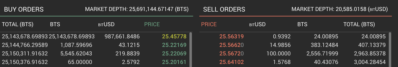 So let’s take a look at the market of BTS and bitUSD. This market has an 101 accounts with 521 orders. The average order is size is about $85. A $500 USD buy or sell order will instantly fill within 1.2% of the market mid price.