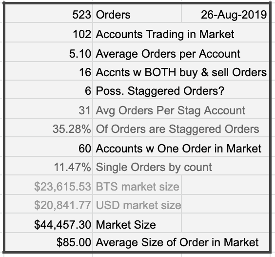 Oh and one more detail, so this market had what appeared to be several staggered orders bots that were outside of the range, with all orders on one side of the market. My current formula requires multiple orders on both sides of the market to count and suspect it is a staggered orders bot, that said it explains some of the difference in the Singles orders being 11% and staggered orders being 35% of the market. One also can calculate that 15 accounts with both buy and sell orders makes up 30 orders or 6% of the market. Some of which would be included in the staggered orders number. Analysis of this type is never precise, but one can get a good feeling of what is going on in the market.