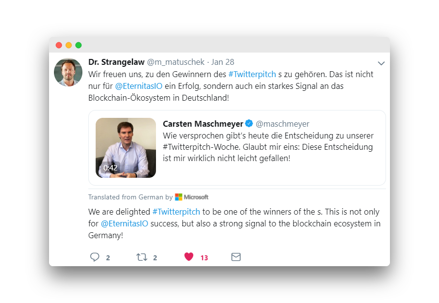 We also launched a task from this profile to support one of our partners called Eternitas in #TwitterPitch event. It was hosted by Carsten Maschmeyer who is the German Shark Tank Judge. And guess what? They are declared as one of the winners of the competition. Many congratulations to the team. It was well deserved! Mega Thanks to everyone from the STEEM community who participated and supported our first task in this series.