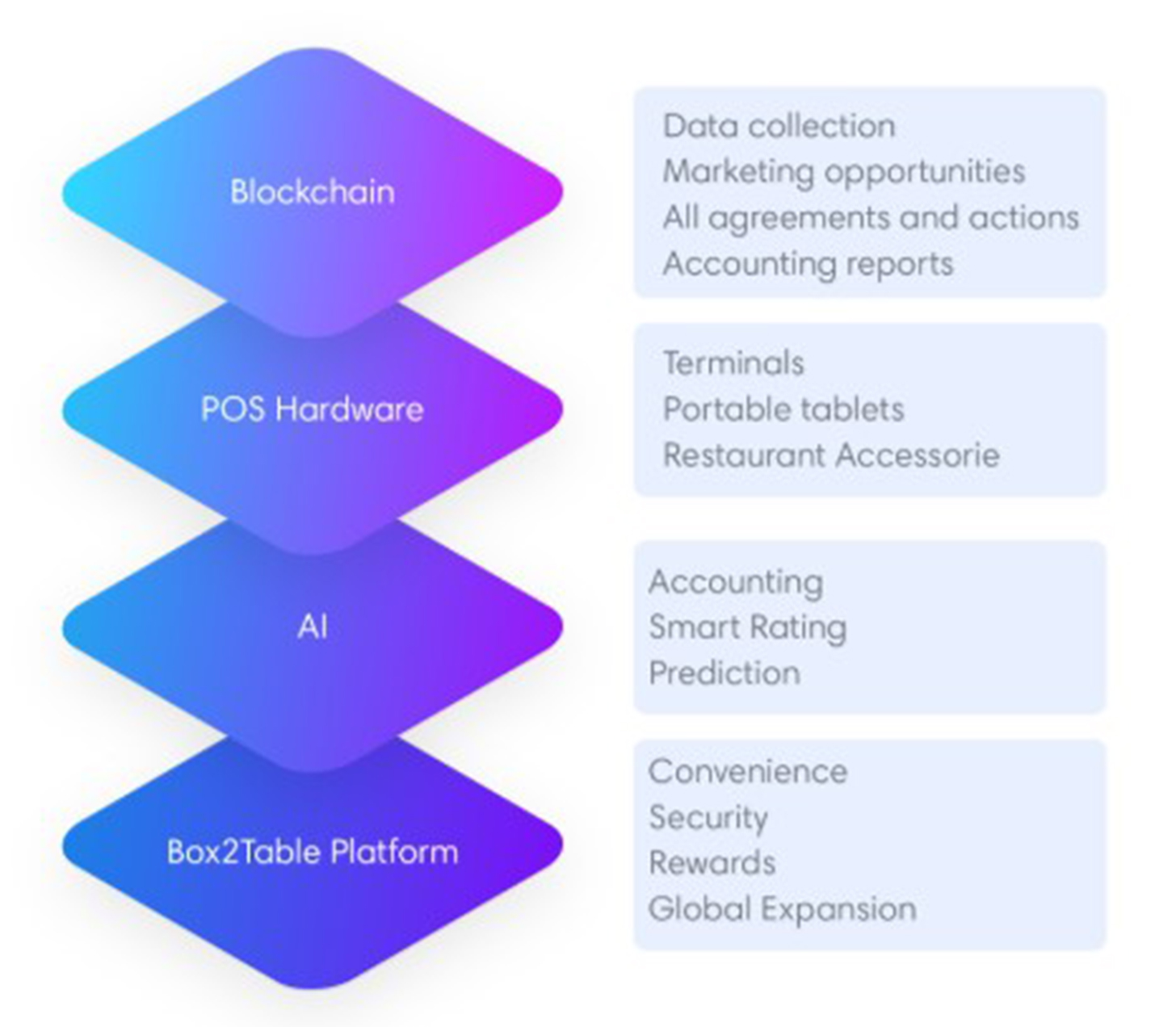 Box2table Inc. is a technology startup, which provides food & beverage enterprises with a comprehensive cloud-based Software as a Service (SaaS) with a Point-of-Sale (POS) terminal; an automated inventory management system powered by artificial intelligence and a decentralized blockchain trading platform between owners of small and large businesses as well as producers and distributors of products around the globe.