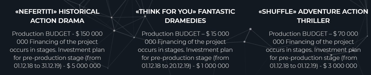 As a result of such problems, viewers do not receive more than 90% of new films and therefore it is important to create a platform that will be able to solve them and able to compete with such well-known monopoly film production companies as Walt Disney, Marvel Studios, 20th Century Fox, Sony Pictures and others.