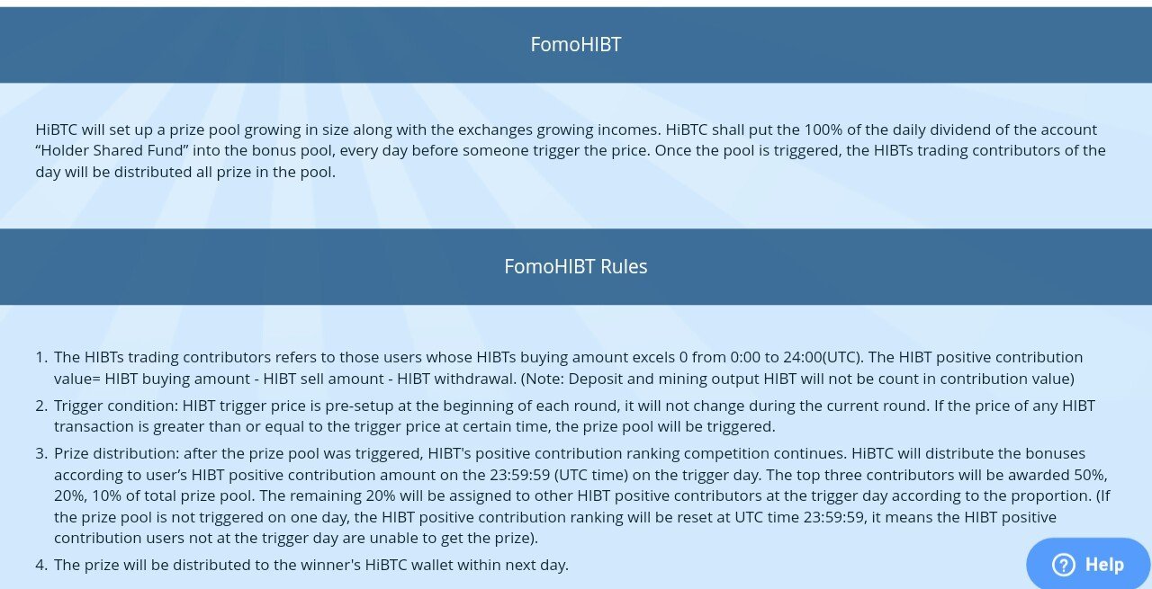 To maintain user loyalty and to promote the rate of transactions in the platform, the FomoHiBT contest was established. This contest rewards traders with the highest trading activities. For more informations about the FomoHiBT, click fomohibt