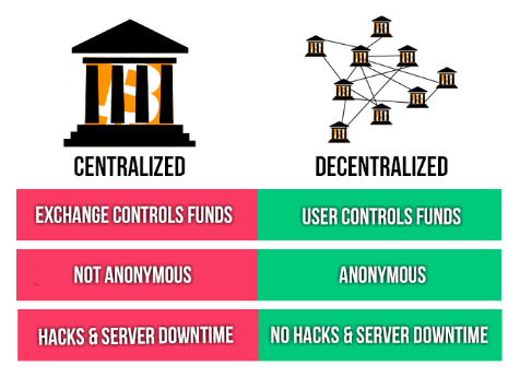 Most of the current existing trading platforms/exchanges such as Binance, Bitfinex, HitBTC and many more are centralized. Centralized means that the funds are controlled by the exchange, it's not anonymous at all and there are several risks, such as hacks that needs to be considered when trading on these platforms. The following graphic shortly describes the differences between a centralized and a decentralized exchange: