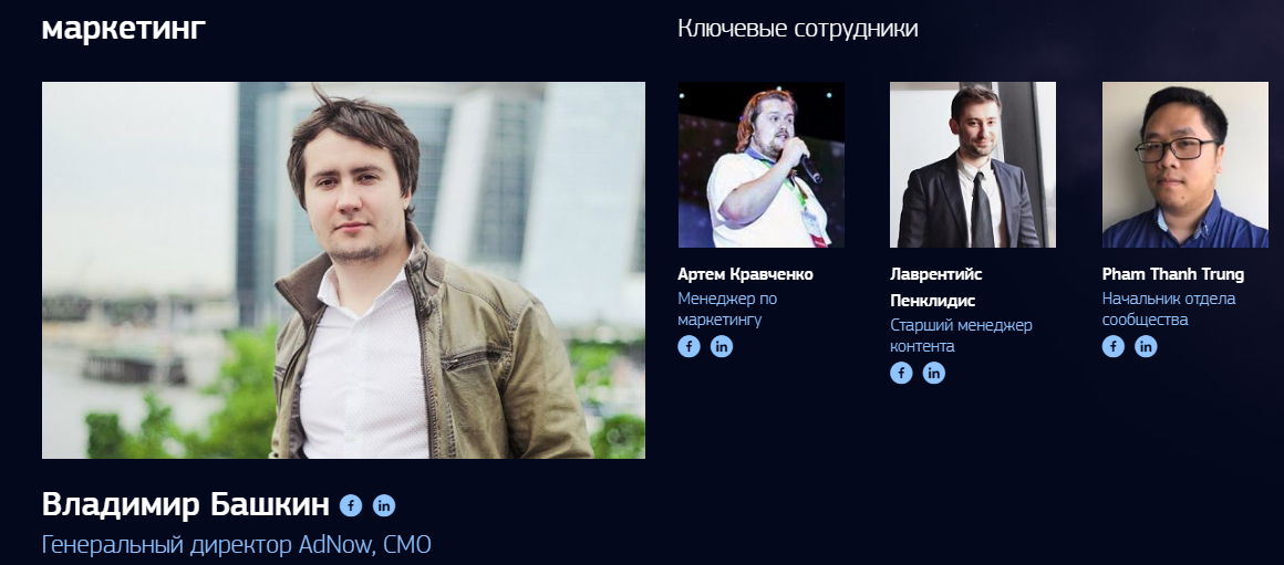 Это были ключевые сотрудники проекта. Кроме них, над разработкой платформы и её продвижением трудится большая команда высококлассных специалистов. В области маркетинга работает Владимир Башкин. Он CEO AdNow и CMO. Работает напрямую с рекламной сетью, которая обеспечивает более 1 млрд показов всего за 24 часа. Владимиру в области маркетинга помогает большая команда. Например, Артём Кравченко, который работает на должности маркетингового коммуникационного менеджера. Лаврентийс Пенклидис отвечает за контент платформы, который позволит привлекать новых пользователей на платформу. Пхам Тханх Трунд – глава коммуникационного отдела. Отличный специалист в своей области.