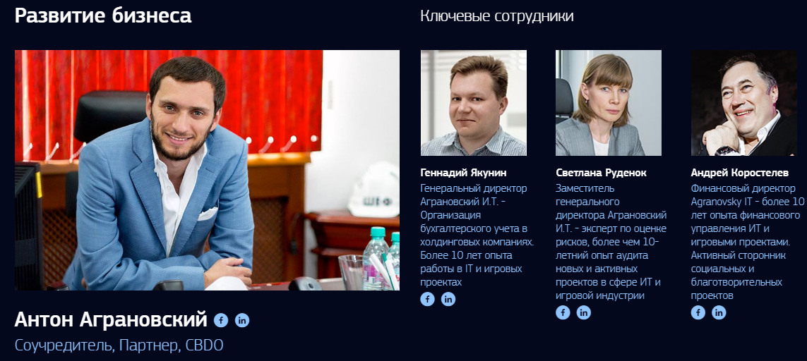 За направление бизнес-развития отвечает Антон Аграновский. Он со-основатель платформы и его ключевой партнер. Имеет свою инвестиционную компанию, которая занимается финансированием IT-стартапов. Ведет проекты от формирования идеи до выхода на IPO. В его команде работает Геннадий Якунин, Светлана Руденок, Виталий Гольбан, Александр Жигаренко, Юлия Двореченская, Игорь Ивченко и Андрей Коростелев.