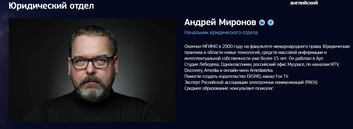 Основателем проекта является Глеб Никитин. Он же СRO. На протяжении последних 10 лет работал над создаем высоконагруженных сетей. Имеет большой опыт работы с Big Data. В свое время обслуживал петабайны информации. Работал с NoSQL и базами данных SQL. Имеет опыт в сфере использования искусственного интеллекта во многих проектах. Работал с С++ библиотеками для систем и сервисов, которые отличались высокой загруженностью.
