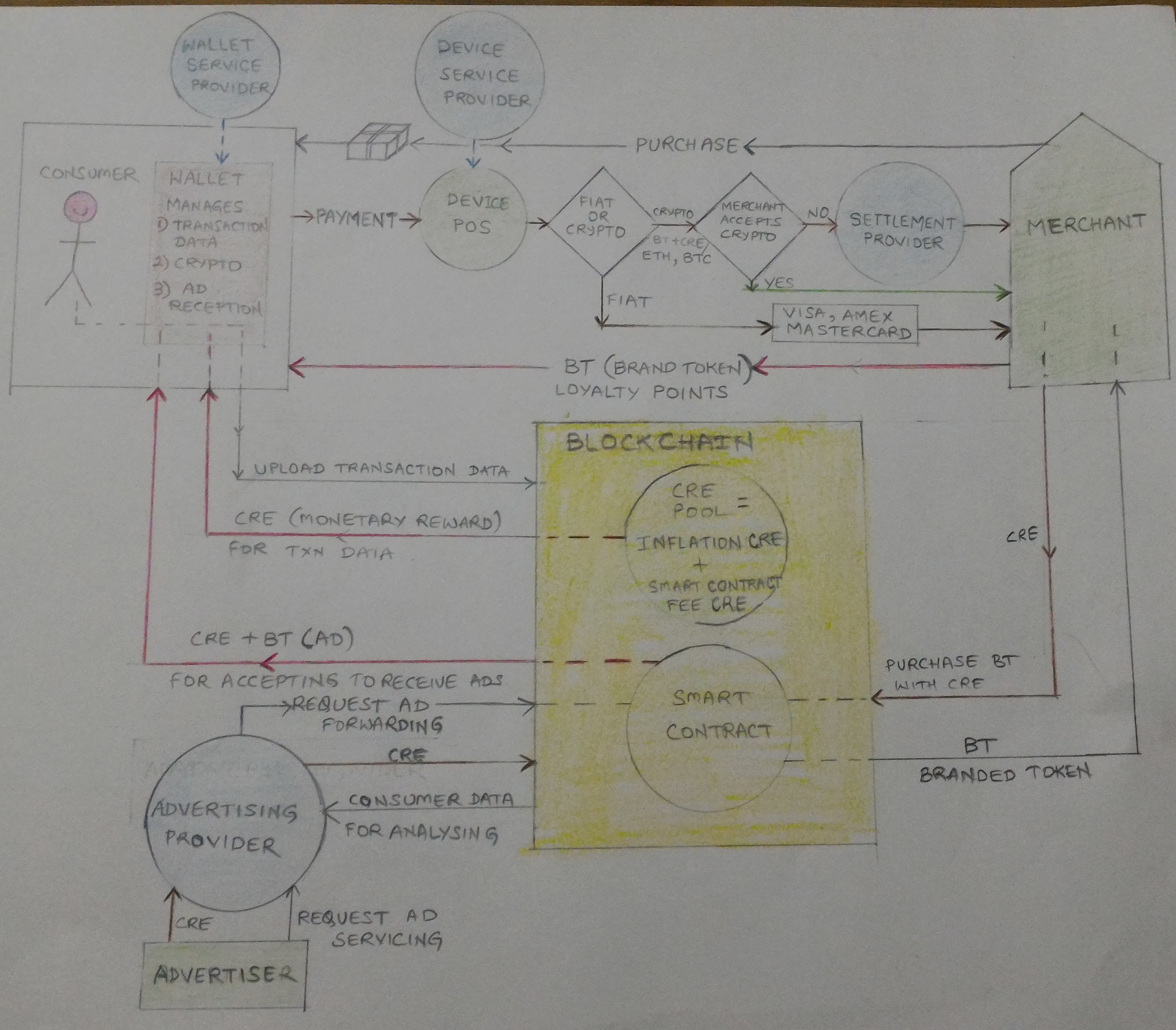 - There is a blockchain where consumers can upload their transaction data and can receive CRE tokens as rewards for doing so.