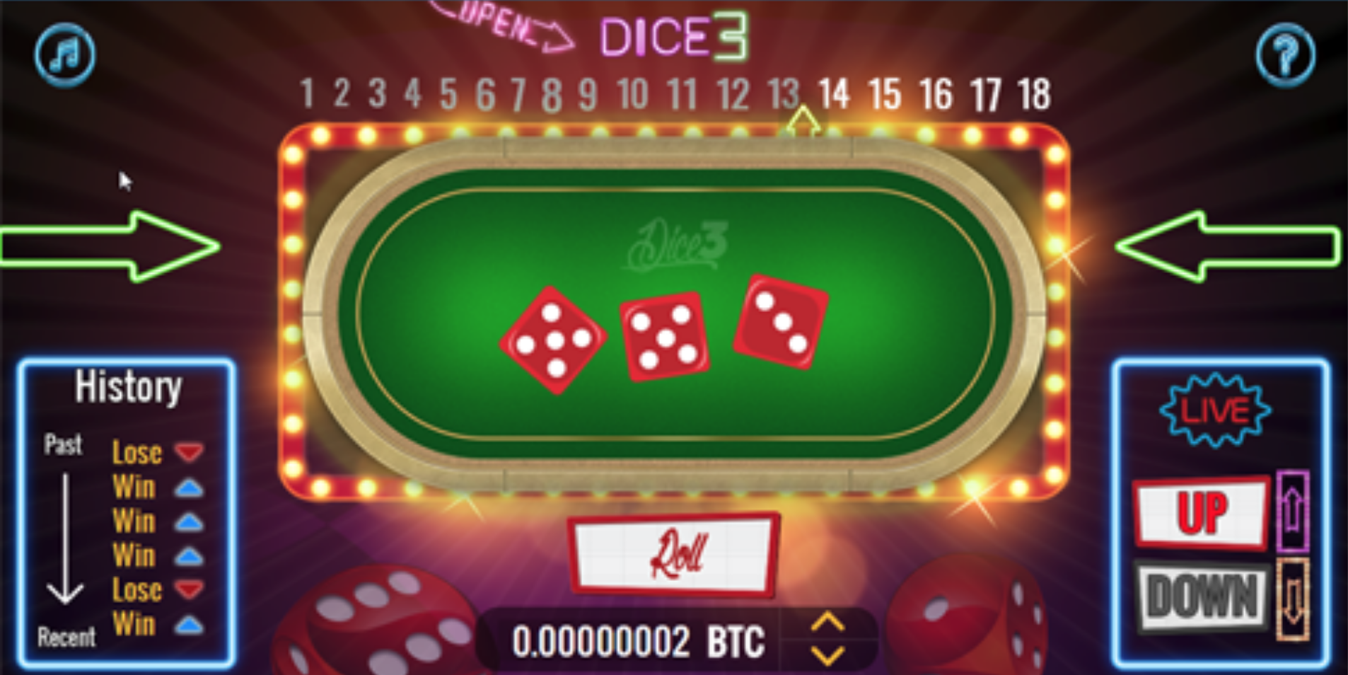 In Dice3, the player should make a choice in a smaller or larger direction - from 3 to 10 or from 11 to 18, respectively. After selecting the dice are thrown. If the sum of the dice corresponds to the range chosen by the player, he gets a reward.