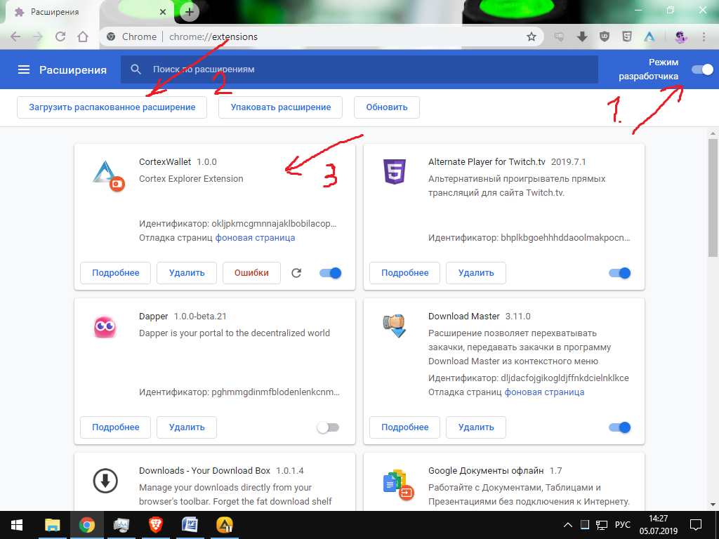 Распаковываем архив, в хроме включаем режим разработчика нажимаем на кнопку «Загрузить распакованное расширение».Я на всякий случай запускал их в разных браузерах чтоб проги не конфликтовали…метамаск в Brave, кортекс в гуглхром.