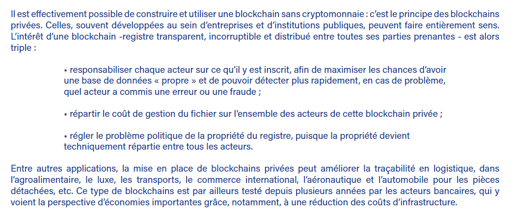 Paradoxalement, la sphère publique si elle veut adopter la technologie blockchain, va s'adosser sur la blockchain à caractère privé, tandis que la sphère privée s'adosse déjà sur la blockchain à caractère public.