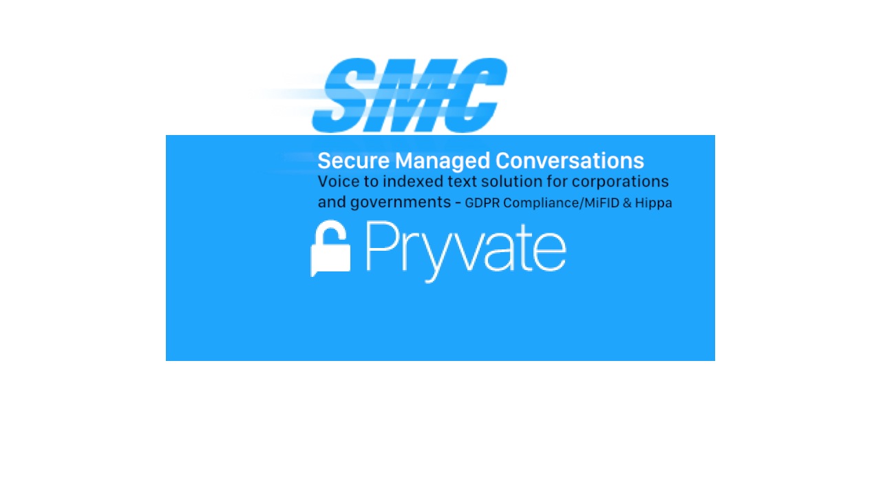 SMC - is a voice to text transcription and analytics service that auto GDPR tags and colour codes identified personal identifiable information , for ease of storage, analysis and retrieval. Encompasses an AI bot that learns your business key words for more improved future proof functionality.