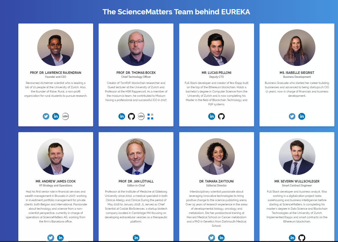 is a scientific review and rating platform fuelled by the EUREKA token from EKA Blockchain Solutions GmbH. Blockchain has the capacity to open science and make research findings immutable, transparent and decentralised. EUREKA revolutionises the scientific publishing and reviewing process by making it more efficient and fair using the EUREKA token to compensate all parties involved. Scientific discoveries can now be openly rated and rewarded based on the quality of the research.