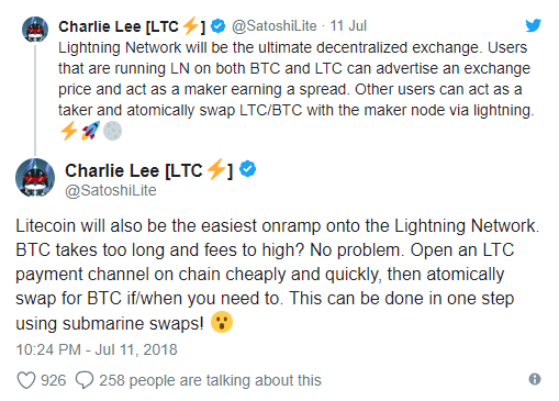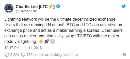 The founder of Litecoin (LTC), Charlie Lee, did not exactly try to hide his support an enthusiasm for LN. He was especially supportive of it yesterday when he released a tweet stating that the LN might even become a full decentralized exchange, where LTC could play a large role.