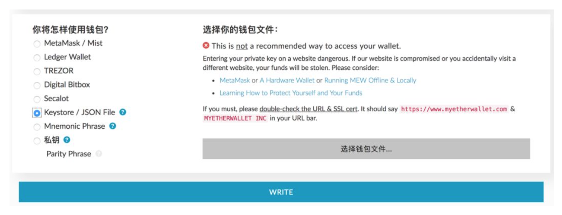 - Choose the way of using wallet as your preference. Input keystore or private key as required and click “write”.