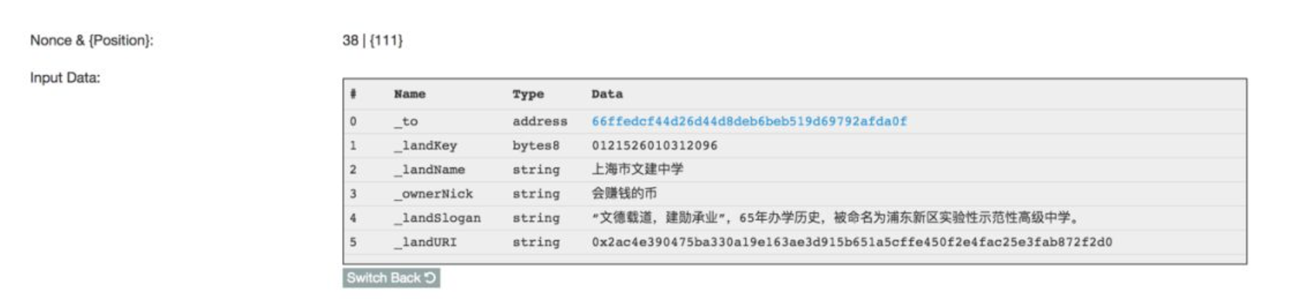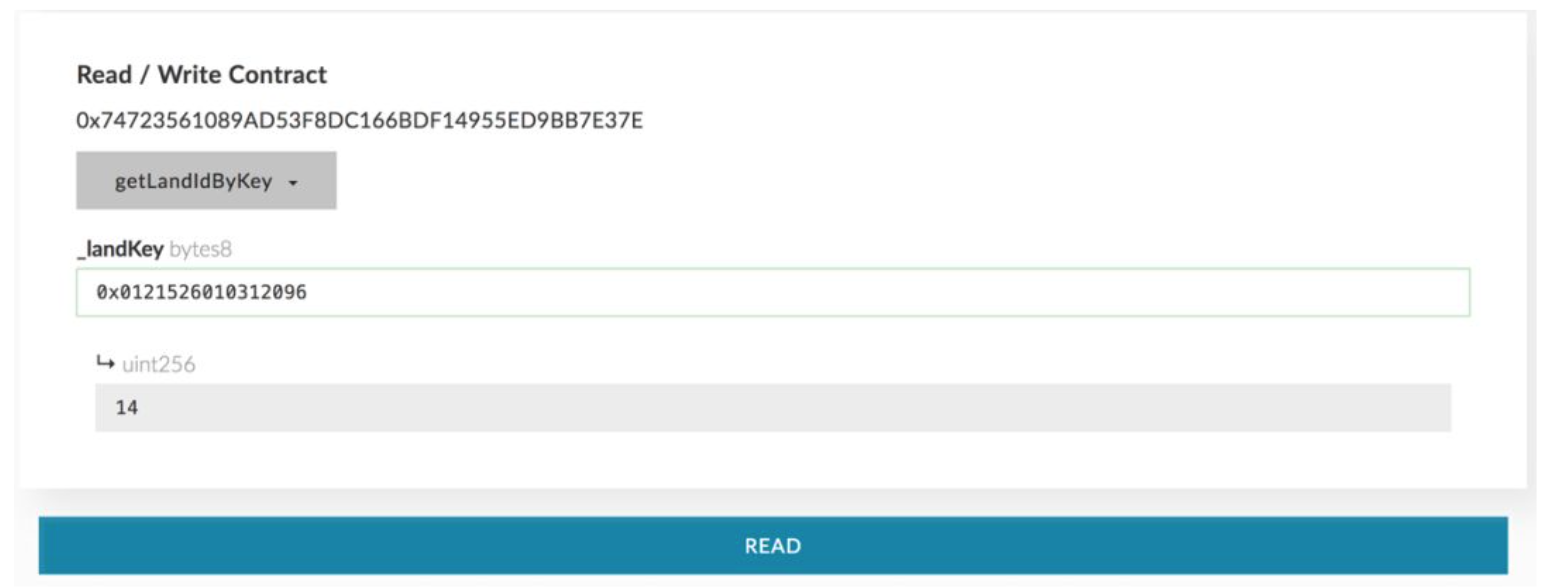 - Get Land ID through “getLandIdByKey” by entering the LandKey you got in the previous step II (remember to add “0x”before the LandKey, in other words, enter “0x0121526010312096”) and click “Read”. You can get landId in a few seconds.