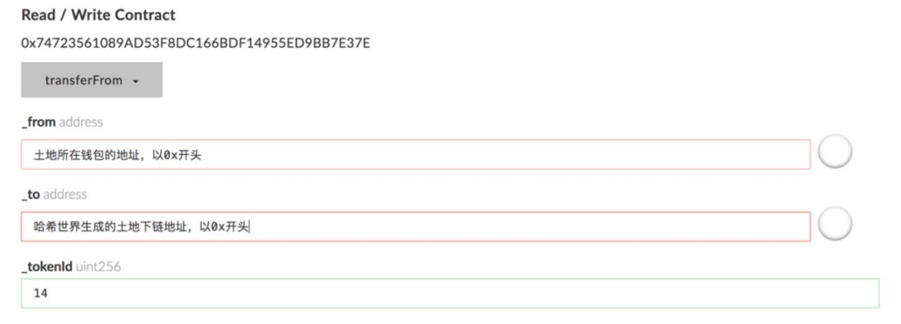 - Choose “transferFrom”. Input “_from”, “_to” and “_tokenId” and you are ready to get your land de-tokenized.