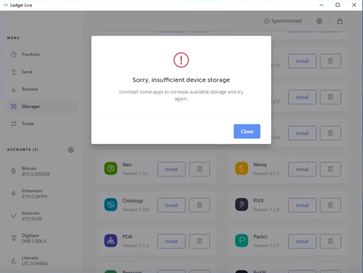 For the rest, even if you were to uninstall some applications on the wallet, the error message will still be prompted whenever an attempt to install the Monero application is made. The only solution is to uninstall all applications on the wallet and then disconnected from the computer. Worry not, as removing the applications does not remove the private keys held within the device and thus the funds are safe. Now, reconnect the wallet, enter the pin code, and approve the synchronization with Ledger Live. With an empty device, the Monero application can be downloaded for everyone.