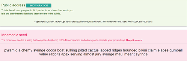Once offline, XMR holders can generate a wallet by clicking on the “generate wallet” button. The action will result in the provision of a public address, which will be used for receiving funds, a mnemonic seed, and private keys (spend key and view key).
