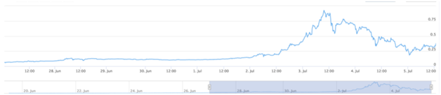 On June 20, Ram RAM in the EOS network cost about 0.01 EOS per kilobyte. July 1, RAM in the EOS network cost about 0.11 EOS per kilobyte. On Jul 03, the price had doubled to 0.20 EOS/KB before blasting off to a current rate of 0.57 EOS/KB