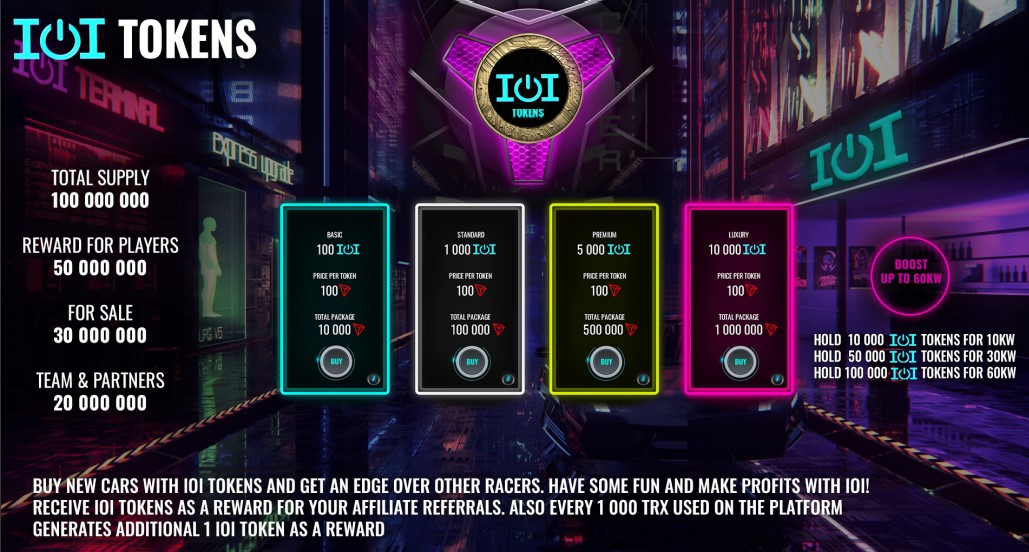 Like it is attainable in the block chain digital space, the IOI token is the internal native token that runs on Tron block chain, this is basically used to power the infrastructure. The platform has been so modeled that by possessing IOI tokens, players now have the ability to build passive income with the IOI-Game staking program, buy or rent higher tiers racing cars in other to win more races, and get even more mind-blowing benefits, therein.