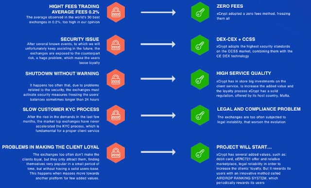 XCRTYPT is the first crypto biological system with a high included an incentive with the heart in its trade: crossover, prepared for securities and for a commercial center made for the erc721. XCRYPT made this start to finish framework which incorporates a charge card and a social platform for our clients to collaborate and make a solid network. This biological system is made to be at a similar dimension as the world's huge players, and even outperform them, for we are as of now appropriate in this present field's future. The differencies among xCrypt and its rivals are a few and will be clarified beneath, in an easy to use realistic. XCRYPT is persuaded that their start to finish biological system could benefit a lot of medium and huge speculators.