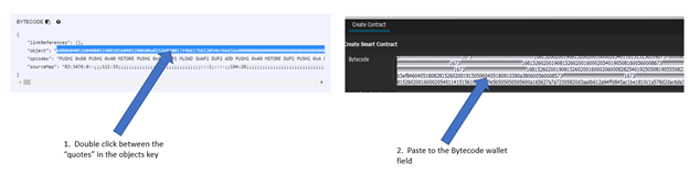 - Copy the bytecode and paste to the HTML wallet field as shown below. Remember to only copy the codes between the objects key.