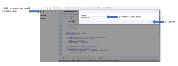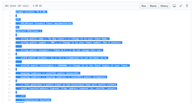 Once the file name is created, paste the “HTMLToken.sol” code to the browser. There are ONLY three modifications needed to be made to the code.