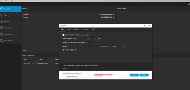 Note: Your Wallet will need to be restarted once you click OK, so close and reopen again. A message will pop up prompting “reindex the blockchain”, click OK. Be patience since the re-indexing process may take a while.