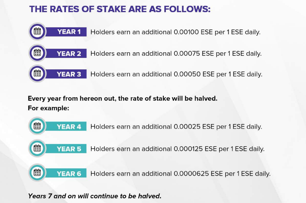 With staking reward system users will receive additional tokens for holding ESE in mobile wallet. The theme is simple, the longer you hold the more you get rewarded.