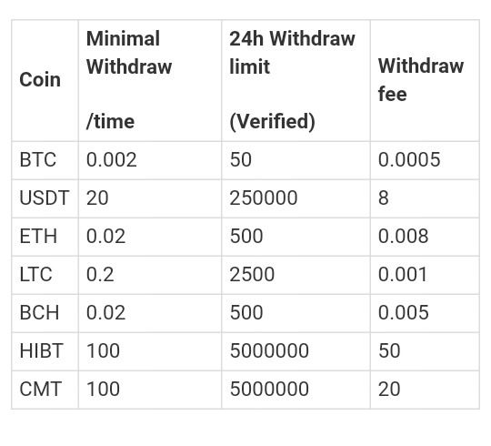 Advantages: Low transaction fees (0.1% - HIBT token reimbursement), withdrawals (0.0005BTC / 8USD), no charge (minimum charge 0.001BTC / 10 USDT )