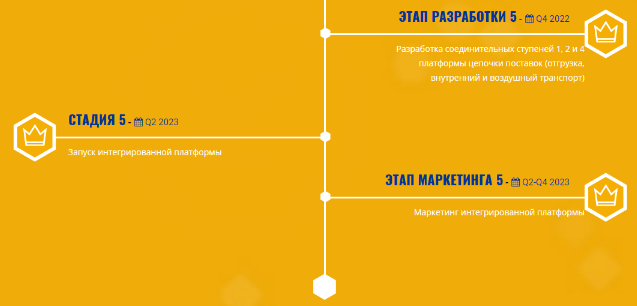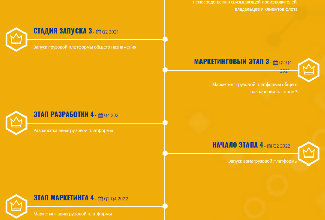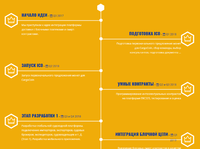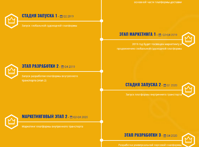 В планах дорожной карты расписана четкая структура развития компании вплоть до 2022 года. В первую очередь, команда займется разработкой логистической платформы. Следующий этап будет включать интеграцию смарт контрактов. В 2019 году произойдет запуск судоходной платформы с последующей маркетинговой кампанией. Следующими этапами развития станут внутренняя, воздушная и сухопутная платформы. Универсальная структура проекта объединит все стороны рынка, позволяя формировать договора посредством смарт контрактов. Перспективы проекта станут более четкими после этапа ICO. Компания стремиться охватить большое количество инвесторов, поэтому продажа токенов распределена до конца 2018 года.