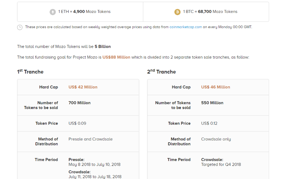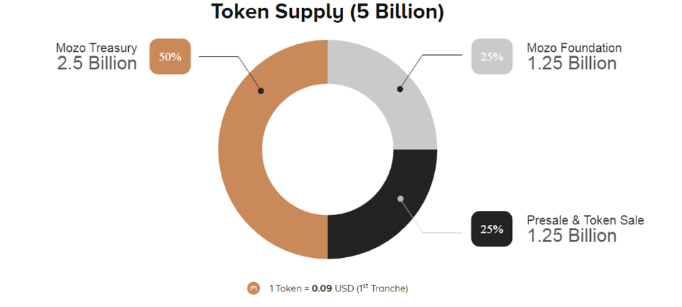 Платформа для продолжения разработок проводит продажи собственных токенов. Они продаются по цене 1 ETH = 8 тысяч Mozo или 1 BTC = 80 тысяч Mozo. В переводе на доллары на первой стадии продаж проект продает 1 токен за 0,09 USD. Количество выпущенных монет составляет 5 биллионов. Они будут распределены в процентном соотношении согласно дорожной карты проекта. 25% или 1,25 биллиона пойдет в фонд проекта. Остальные 1,25 биллиона или другие 25% пойдут на предварительные и основные продажи монет. И оставшиеся 2,5 биллионов или 50% пойдут в направлении Mozo Treasury.