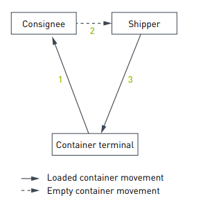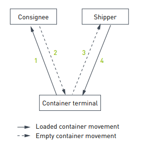 Containers travel in a triangle between a shipping terminal, a consignee, and a shipper. In the current situation, the container always returns to the terminal between trips. In other words, the workflow is terminal>consignee>terminal>shipper>terminal.