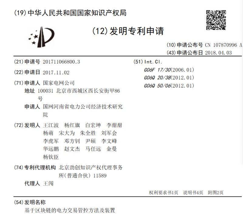 今年4月3日,中国国家电网公布“关于区块链的电力交易管控方法及装置”的专利申请,根据申请摘要,该专利旨在解决能源中心化机构在管理中产生的运行成本高、安全性差以及用户隐私难以保证等问题。