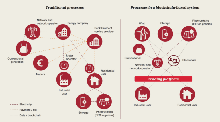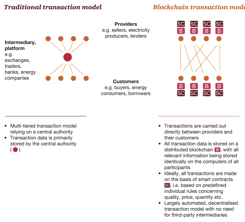 上图左边是传统供电网络,右边是区块链供电网络。在传统供电网络中,电力从发电厂发出还得经过电网及电网运营商、能源公司、作为支付提供方的银行、电表运营商等的多方参与。