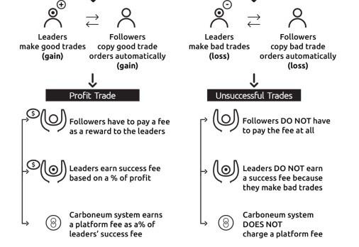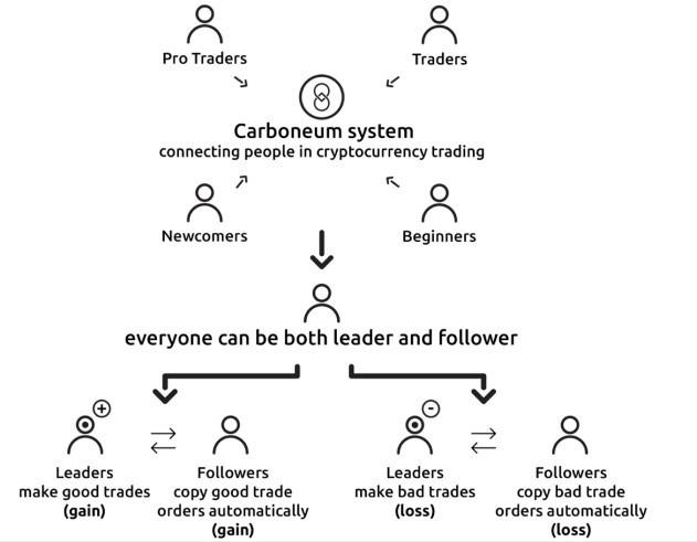 There are a number of projects that simplify the transaction process. For example, Kryll has developed an intuitive platform that allows traders to create and share their trading strategies with each other but it will be difficult for traders to judge which strategy is good and Verify that traders are actually sharing the strategy effectively. Another example of a trading platform is eToro, eToro also allows people to follow successful traders. However, eToro is a centralized platform. Therefore, on this basis information of the trader can be abused and manipulated by the company. Meanwhile, Carboneum is decentralized and encourages both novices and professionals to participate in their own for-profit network. Leaders are selected based on evidence of their transactions, which can be easily verified. The system works simply and effectively by using transaction records and connecting traders together.