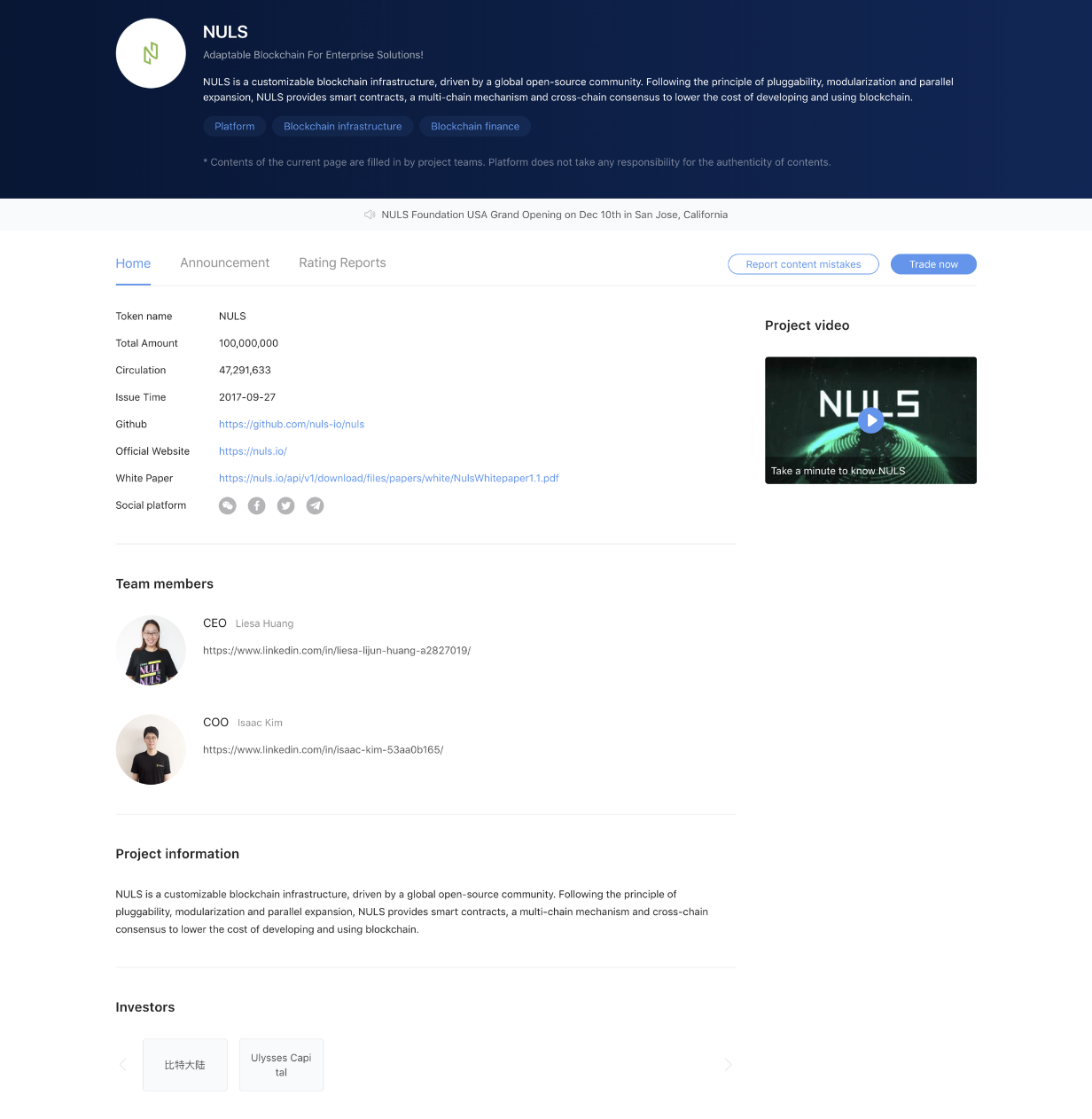 On the project page, details such as project background, total token supply, issuance time, core team members, and white paper are clearly exhibited. On top of these, you can also find the weekly updates of each project, as well as trustworthy third-party rating reports for your in-depth evaluation.