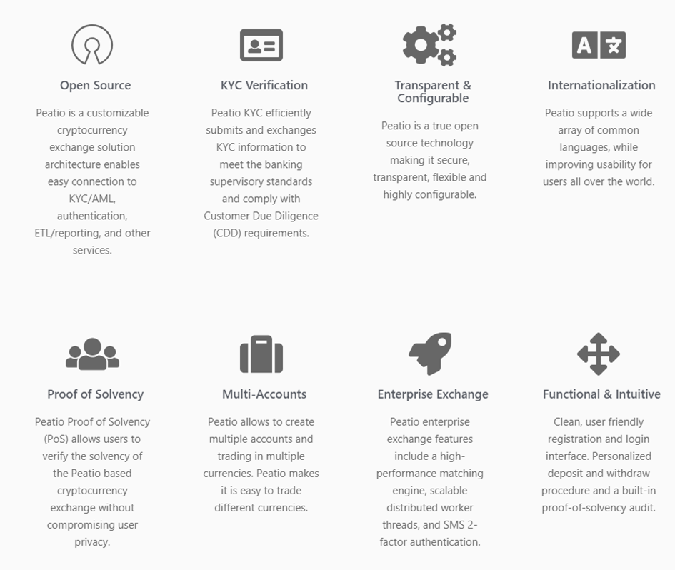 Transparent and customizable: Peatio is a real open source technology that provides reliability, transparency, flexibility and the ability to customize all new projects based on the blockchain;