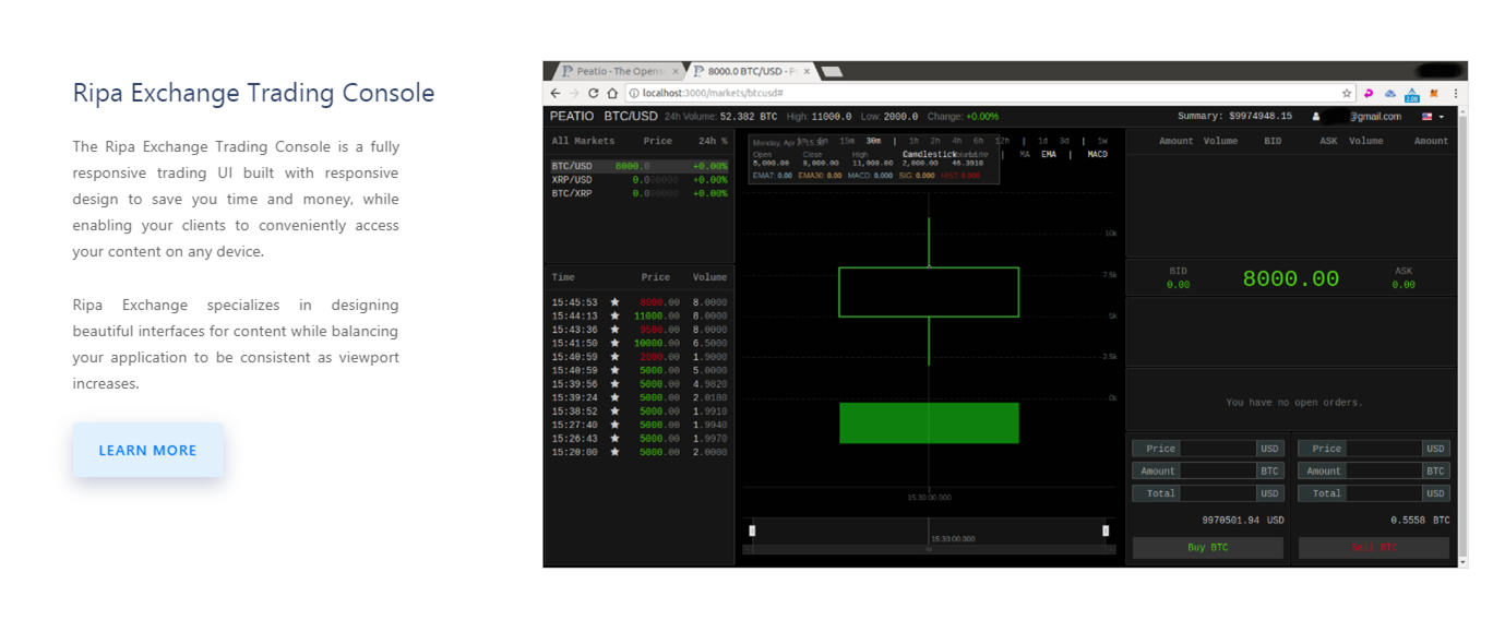 Ripa Exchange Trading Console is a fully responsive trading interface, built with flexible design, which gives you an excellent opportunity to save time and money, allowing your customers to conveniently access your content on any device.