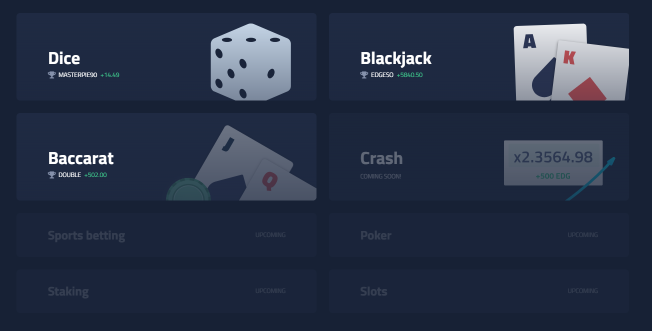 Edgeless- это первое полностью децентрализованное онлайн-казино на платформе Этериума. На текущий момент на платформе уже реализованы Блэкджек, Кости, Баккара и Краш.