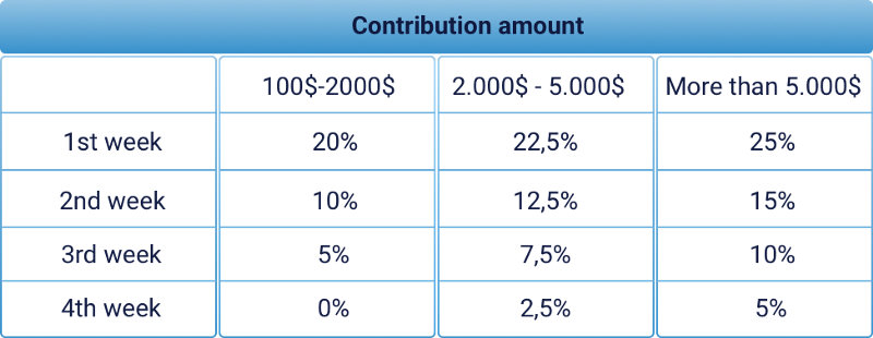 All you have to do is just enter an account, that has been created for investments, and invest the funds using Republia wallet addresses or an Escrow address (Boris Shulyaev). When investor invests funds via Escrow, bonuses will be lower than when investor invests directly. Bonuses for investments via Escrow are accrued according to the table: