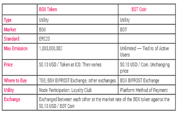 • The BGX token is used for the Node Participation; Loyalty Club, as well as the BGT token, is used for Platform Method of Payment.