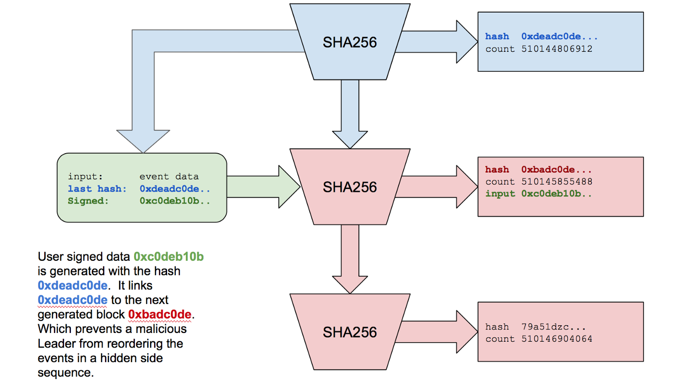 Inputs into Proof of History can have references back to Proof of History itself. The back reference could be inserted as part of a signed message with the users signature, so it cannot be modified without the users private key. This is just like taking a photograph with the New York Times newspaper in the background. Because this message contains 0xdeadc0de hash we know it was generated after count 510144806912 was created.