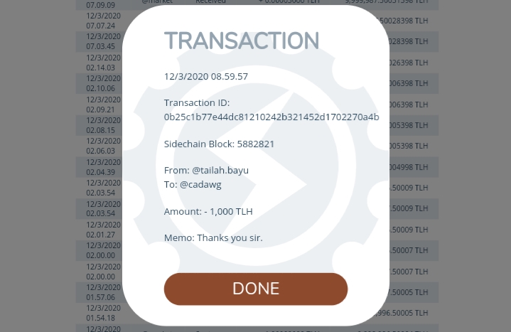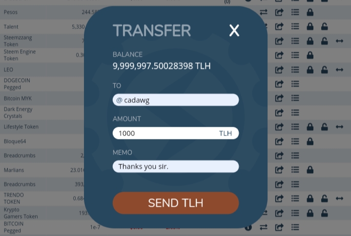 And a big thank you to Mr. @cadawg who helped me give 100 ENG on steem-engine and vice versa as my thanks, I sent 1000,000 Token TLH with (ID 0b25c1b77e44dc81210242b321452d1702270a4b)