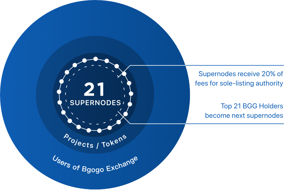 Платформой предусмотрен 21 супернод. Основная их масса включает ведущие институты шифрования по всему миру. Эти объекты будут участвовать в частной продаже токена BGG. Играя ключевую роль в экосистеме Bgogo, каждый супернод будет наделен правом «один голос, один список», а также преимуществом «пожизненного» отчисления 20% от комиссии за принятые в список торгуемых активов монеты.