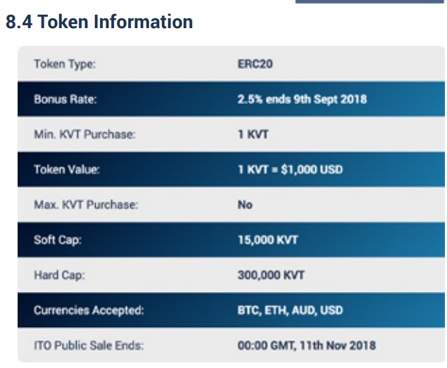 ITO Pre-sale of the KVT tokens are ongoing, and the public sale will commence on September 10, 2018, to November 11.