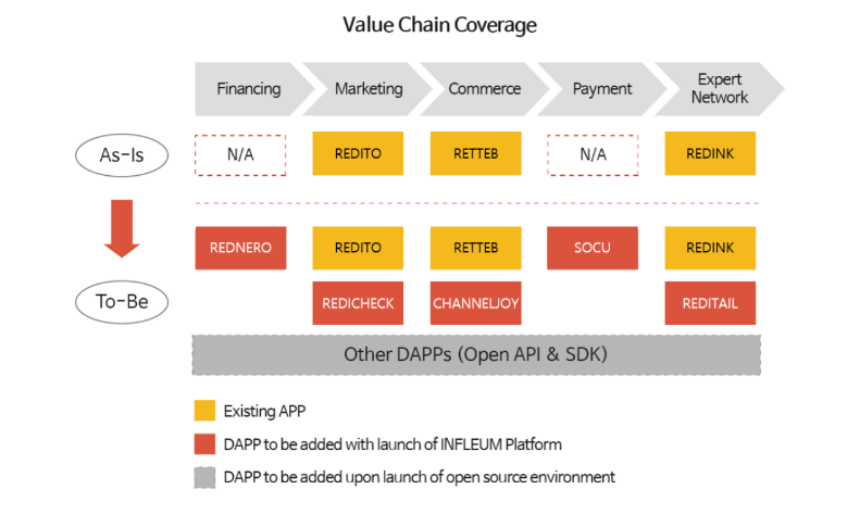 The existing apps are for the core funtional uses of platform. The image shows how Infleum is planning to evolve in future with time. Infleum platform is a opensource platform which makes it truley decentralized and any third party user can use and build apps with rules of Infleum.